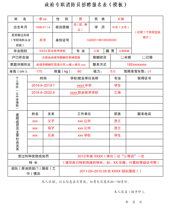 1、政府專(zhuān)職消防員招聘報(bào)名表(模板)