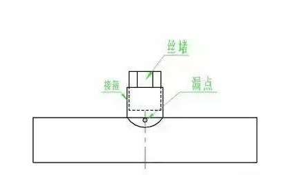 (1)當(dāng)漏點(diǎn)呈一小圓孔時(shí),可用石棉繩一段壓入小孔,然后用尖頭小錘砸緊,再由外向內(nèi)逐步焊住,焊接時(shí)電弧不可直接吹向漏點(diǎn)。