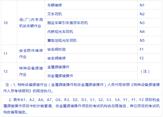 特種設(shè)備安全管理人員、叉車(chē)司機(jī)、起重機(jī)司機(jī)、起重機(jī)指揮、壓力容器、鍋爐、氣瓶充裝、電梯安裝與維修、觀(guān)光車(chē)、客運(yùn)索道操作與修理、大型游樂(lè)設(shè)施操作與維修等等。