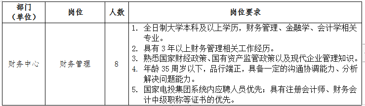 面向國家電投集團(tuán)系統(tǒng)內(nèi)、外招聘財務(wù)管理崗位人員8人。