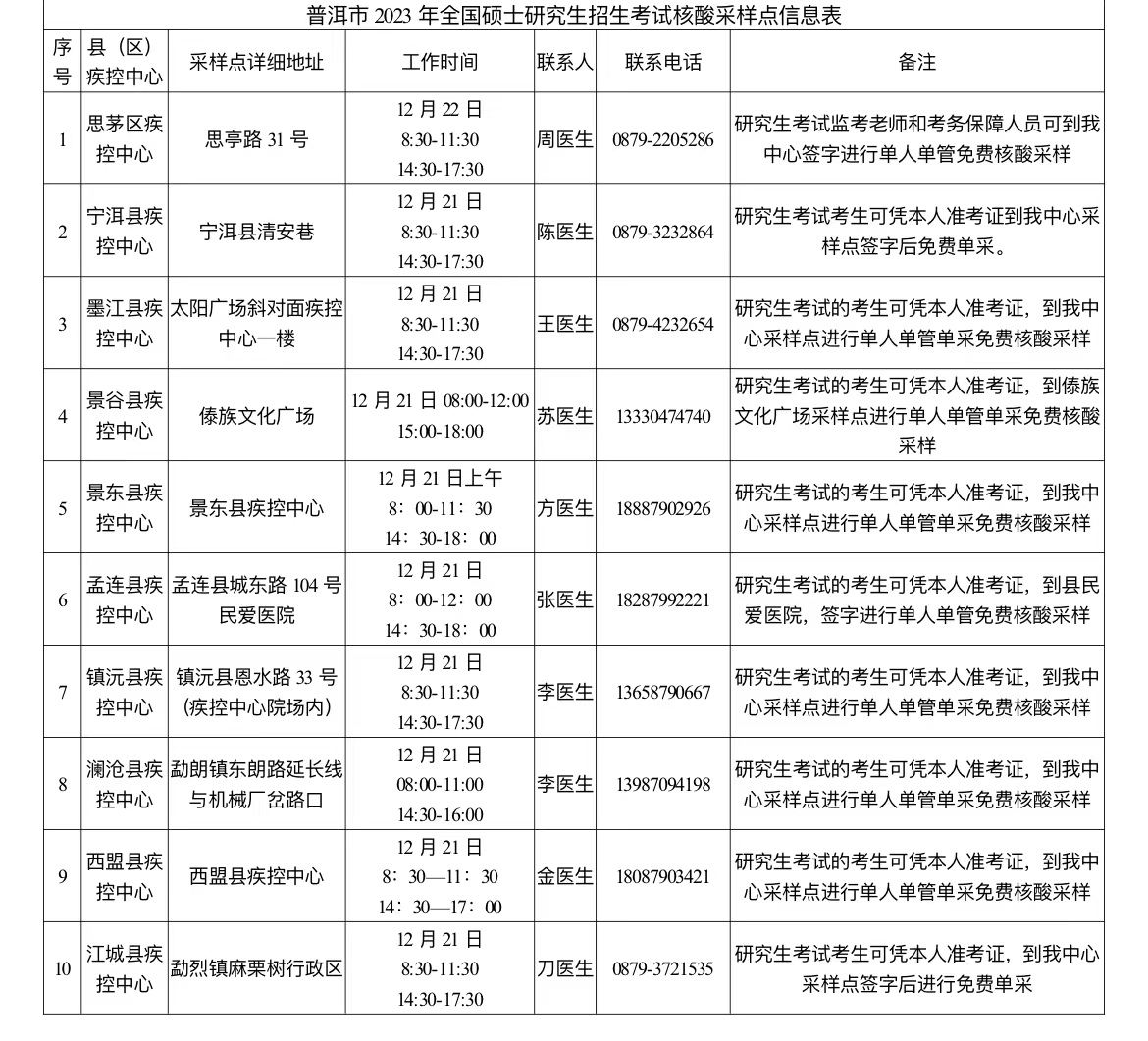 附:普洱市2023年全國(guó)碩士研究生招生考試核酸采樣點(diǎn)信息表