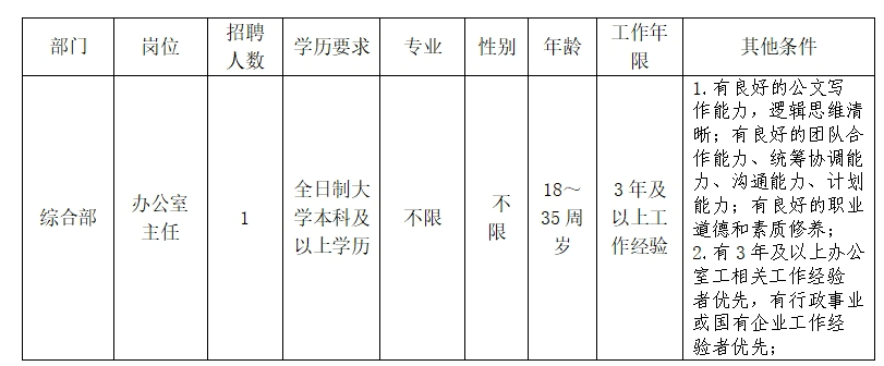 為加強(qiáng)人才隊(duì)伍建設(shè),優(yōu)化專(zhuān)技人員結(jié)構(gòu),結(jié)合公司工作實(shí)際,計(jì)劃公開(kāi)招聘辦公室主任一職,為確保公開(kāi)招聘工作順利進(jìn)行,現(xiàn)將有關(guān)事項(xiàng)公告如下: