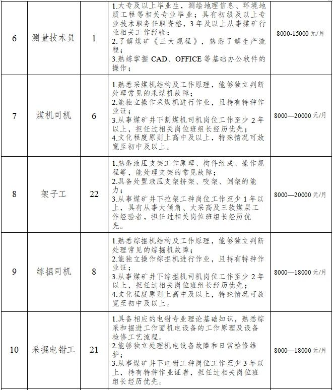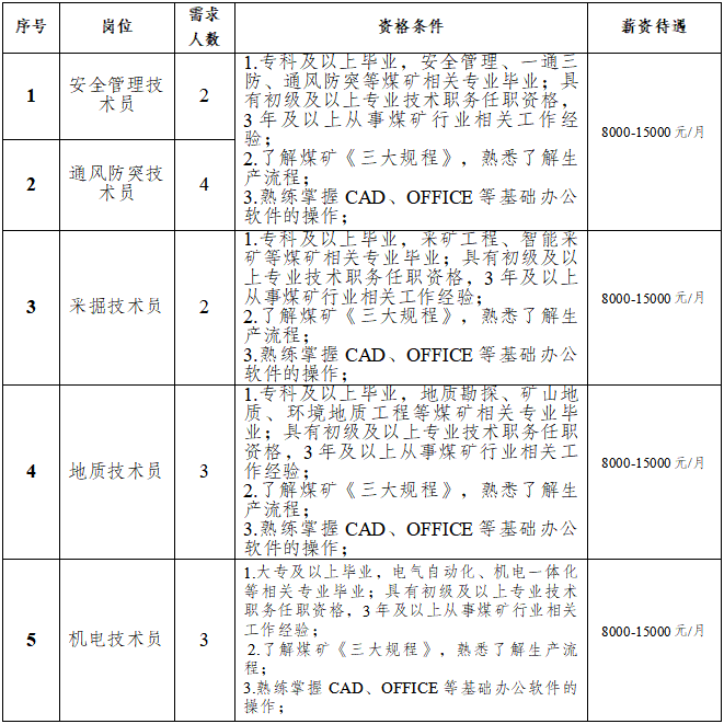 原則上年齡一般不超45周歲,特殊崗位技術(shù)人才可適當(dāng)放寬年齡至50周歲以內(nèi),但需個(gè)人確保到齡退休時(shí),養(yǎng)老保險(xiǎn)繳費(fèi)年限符合退休條件;持有井下相關(guān)操作技能等證書優(yōu)先考慮;身體健康,無(wú)相關(guān)職業(yè)禁忌癥。