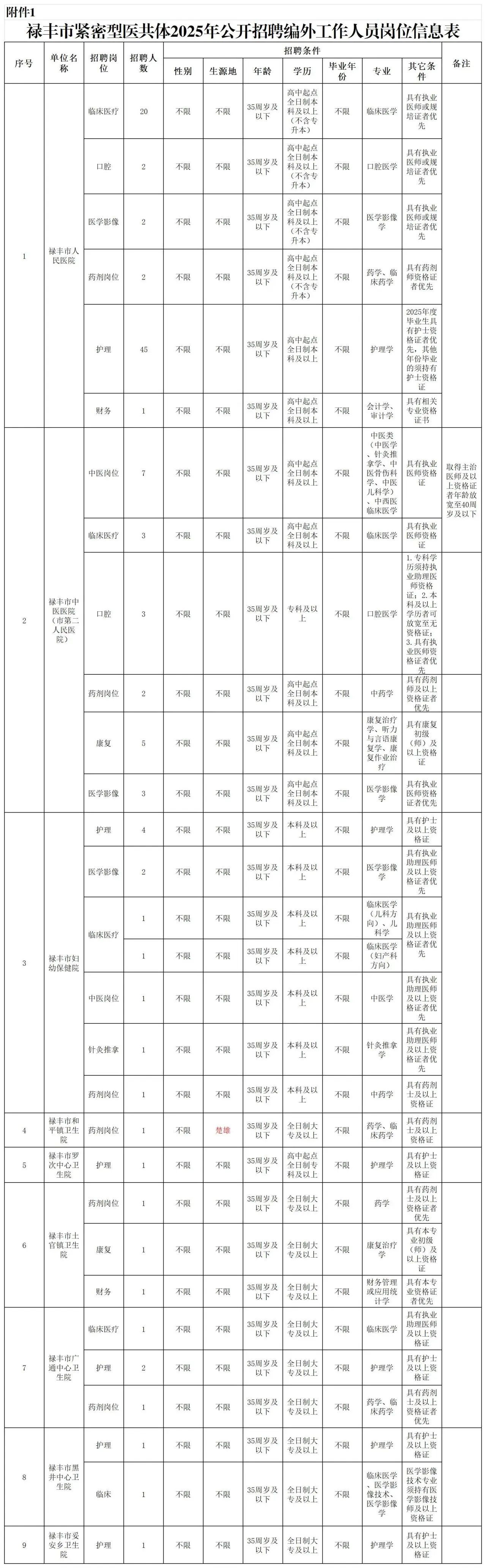 附件:1.祿豐市緊密型醫(yī)共體 2025年公開招聘編制外工作人員崗位信息表