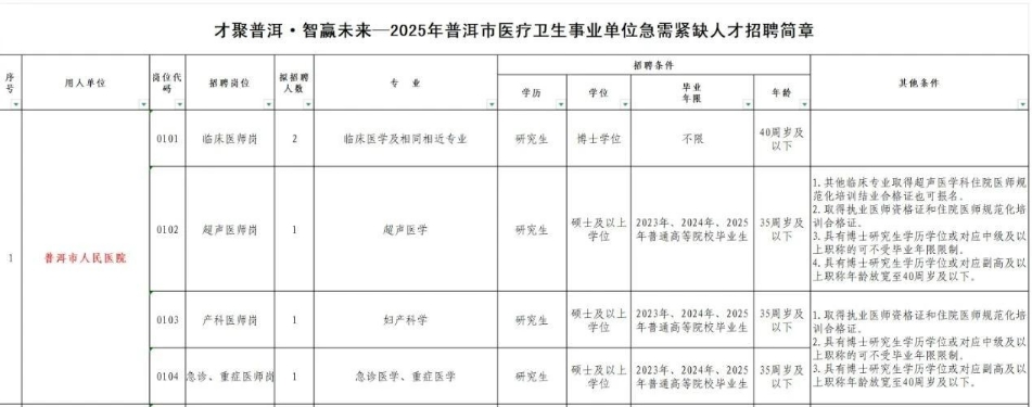 2.應(yīng)聘人員符合應(yīng)聘崗位要求的專業(yè)、學(xué)歷、畢業(yè)年限、年齡和其他條件,具體以《2025年普洱市醫(yī)療衛(wèi)生事業(yè)單位急需緊缺人才招聘簡章》(附件1)為準;