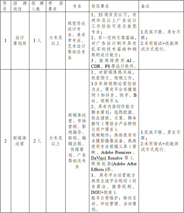 澄江市文化旅游投資開發(fā)有限責(zé)任公司數(shù)字傳媒分公司致力于服務(wù)澄江傳媒和文化產(chǎn)業(yè)發(fā)展,主要業(yè)務(wù)有影視制作、新媒體平臺(tái)運(yùn)營(yíng)、戶外廣告位經(jīng)營(yíng)、廣告物料設(shè)計(jì)制作、文化傳播、活動(dòng)策劃等。為提高公司業(yè)務(wù)經(jīng)營(yíng)能力,加強(qiáng)國(guó)有企業(yè)人才隊(duì)伍建設(shè),結(jié)合公司發(fā)展及相關(guān)計(jì)劃安排,擬面向社會(huì)公開招聘工作人員3名,F(xiàn)將有關(guān)事項(xiàng)公告如下: