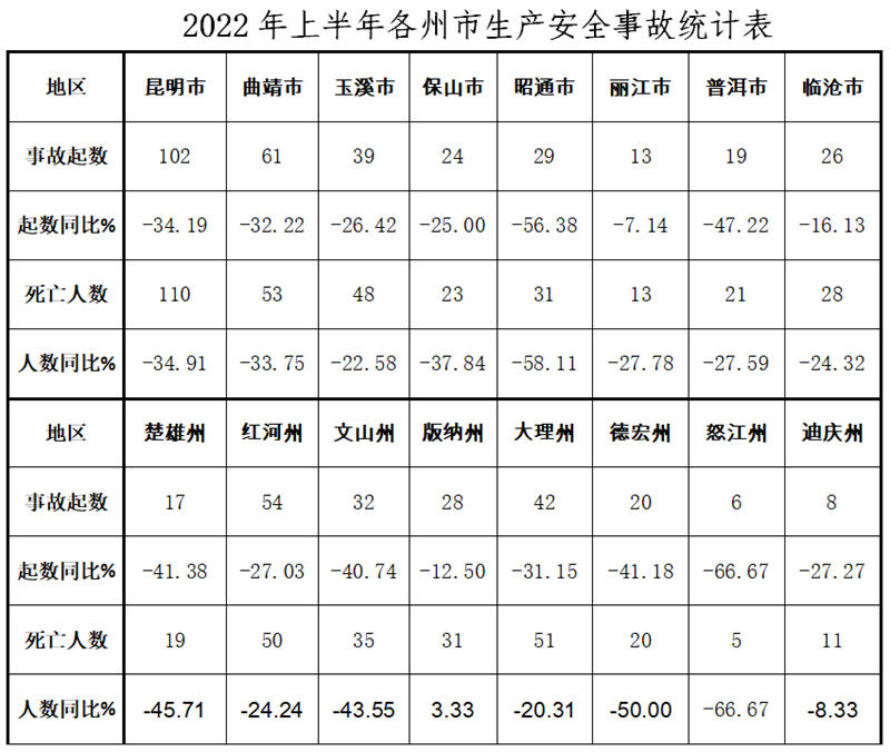 1至6月份,5個(gè)州(市)發(fā)生較大事故:大理白族自治州3起、死亡9人,同比增加2起、6人;曲靖市1起、死亡4人,同比增加1起、4人;玉溪市1起、死亡6人,同比起數(shù)持平、死亡人數(shù)增加1人;文山壯族苗族自治州1起、死亡3人,同比減少1起、4人;迪慶藏族自治州1起、死亡4人,同比增加1起、4人。各州(市)事故總體情況詳見下表: